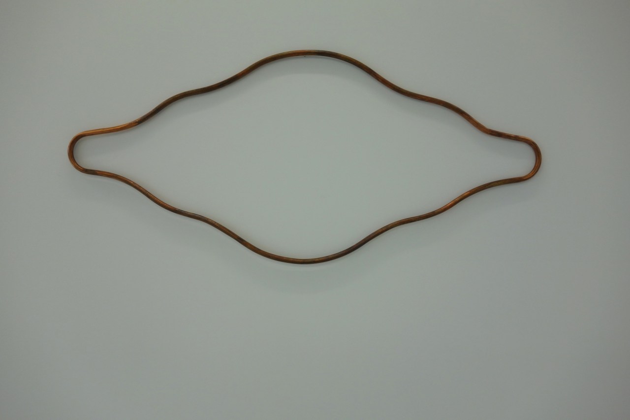 Sinegen 75 x 150 cm, kobberrør Lang 1 205 x 8 cm, rustfritt stål, kobbertråd og hjul i aluminium Små svarte Ø 4 x 15 cm pigment på dreiet tre.
