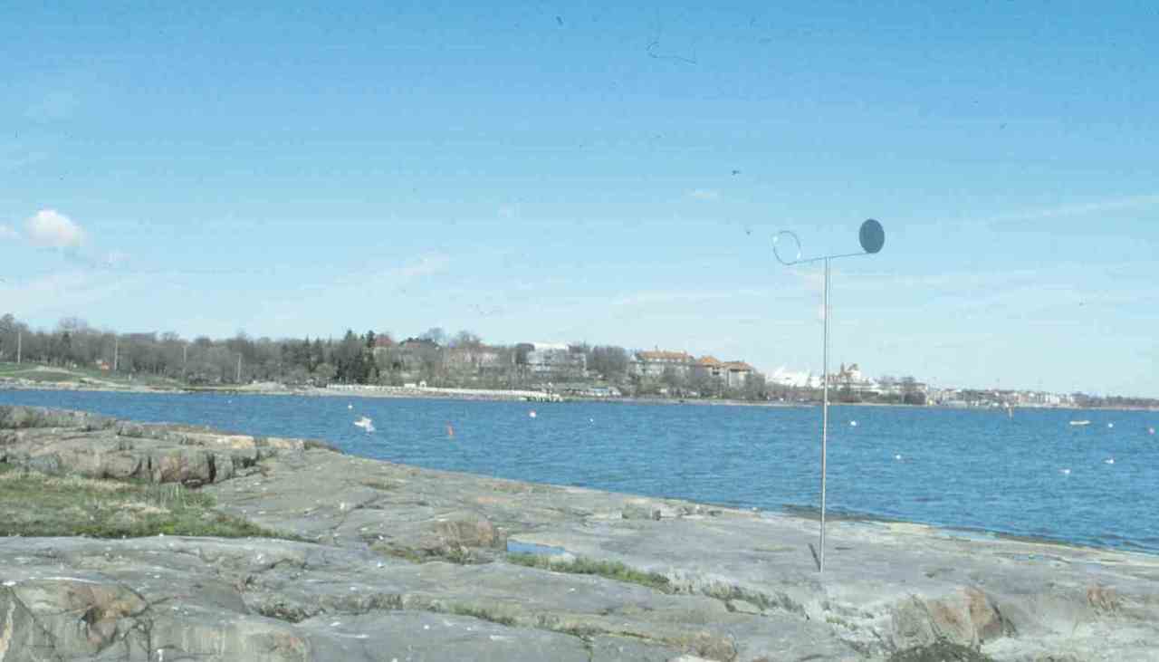Syrefast rustfritt stålrør ; 310 x 110 cm , sirklene Ø 30 cm, beveger seg i vinden.