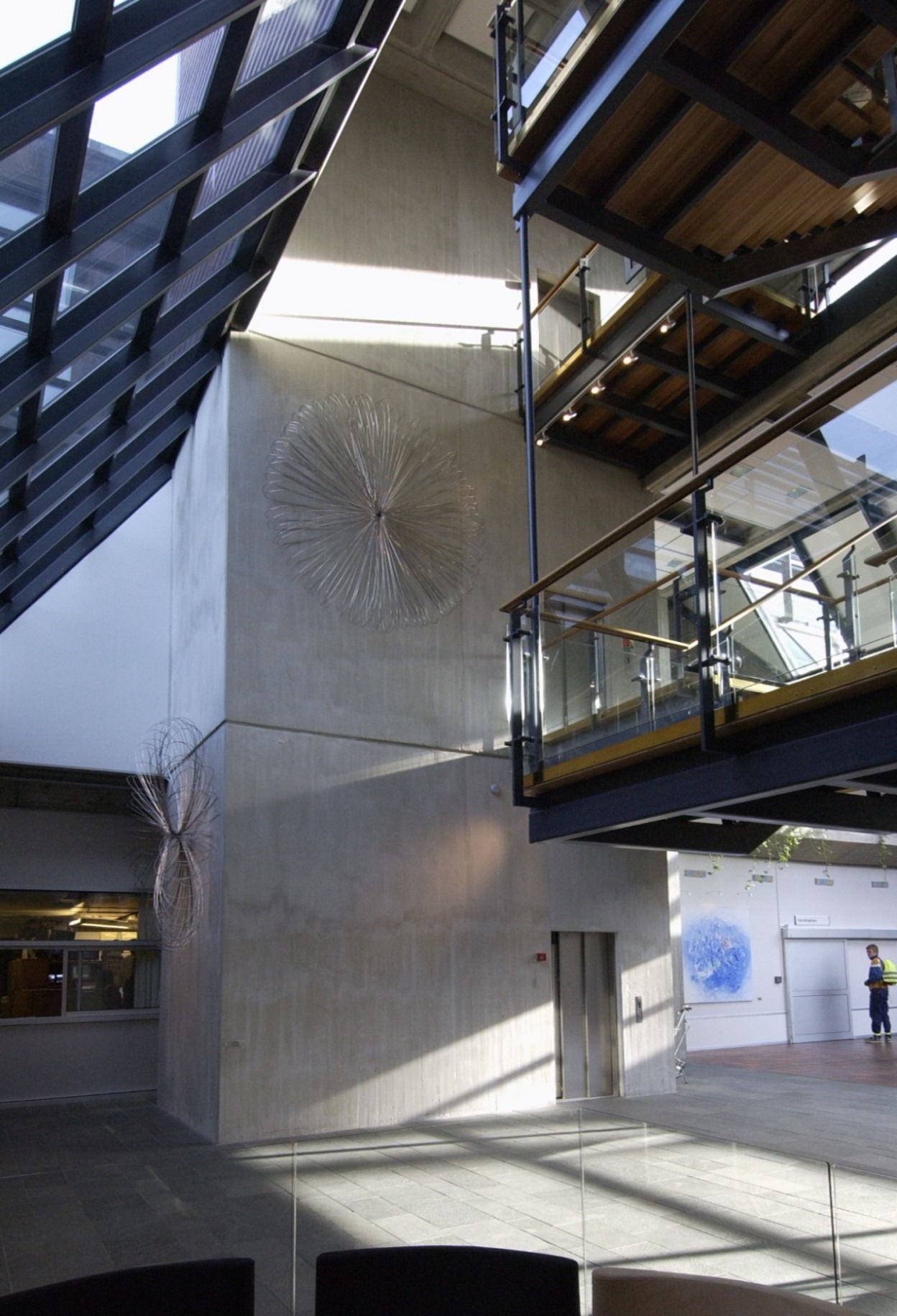 Overlys i inngangspartiet: 25 stk. á Ø30 cm sandblåst sirkelmotiv i hvert overlysvindu á 90 x 90 cm. Trapperom fra 1. til 3. etg., høyde 12 m x gulv nede 600 x 1200 m. 3 skulpturer i 5mm syrefast rustfritt rundstål, á Ø 250 cm i ca. 90 omdreininger. Rytme, puls er noe av mine grunnideer bak skulpturene. Konseptet ble til da jeg satt og tvinnet ståltråd rundt hånden – knyttneven er like stor som hjertet. Hver omgang rundt hånden er som et hjerteslag. I dette tilfellet ble det hastighetspuls 90 omdreininger = energi. Bevegelse i gangen og i trapperommet får frem bevegelsen, variasjonene i skulpturene.
