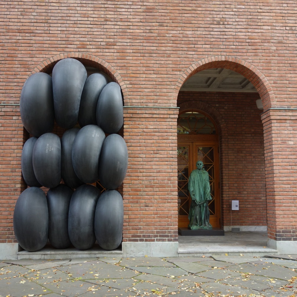 Installasjon av 13 gummislanger á Ø 1,25 -1,5 m blåst opp og utover sin opprinnelige dimensjon og installert inn i en av bue åpninger i Borggården i Vigelandmuseet.