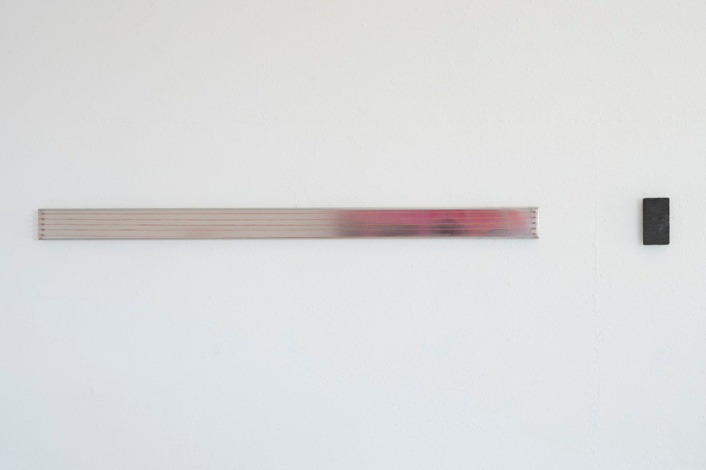 TEOS 1 (VERK 1) 5 tynne kobbertråder er strekt langs lengden av en langstrakt stålplate på hver stålstift i endene. Uttrykket til rustfritt stål er industrielt, og kobber er kjent for sine elektrisk ledende egenskaper. Verk 1 ble skapt som en del av en stedsspesifikk installasjon som omhandlet naturens betydning og verdi i ulike sammenhenger, på nært hold, som et sanselig rom og i det store bildet, som en naturressurs og grunnlaget for vår eksistens.
