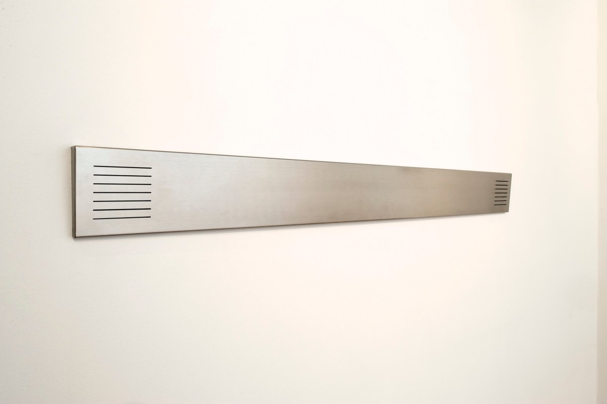 2 Published april 25, 2016 at 2341 × 1558 in Välitila 2011 ← Forrige Neste → Innsikt og Utsikt; 2 syrefast rustfritt stålpaneler 15x3x155cm perforet med tynne strek i begge ender. Montert i ansiktshøyde på frontveggen ved siden av inngangen og på veggen i Foajèn